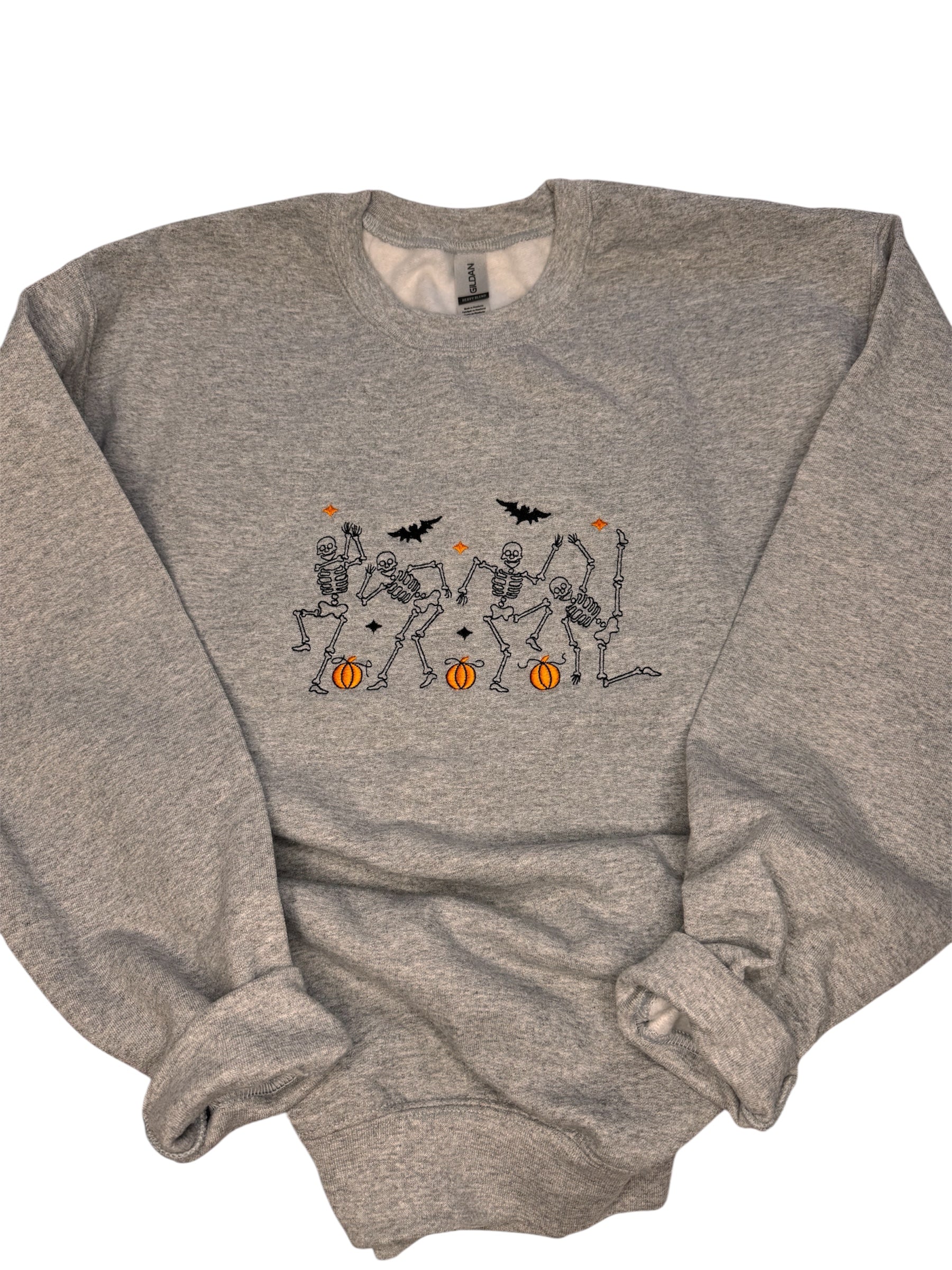 Spooky season just got a whole lot cuter! 👻 This cozy embroidered sweatshirt features a crew of dancing skeletons, bright orange pumpkins, and a few cheeky bats flying by. It’s soft, comfy, and perfect for pumpkin patch strolls, fall festivals, or just sipping cider on a chilly night.